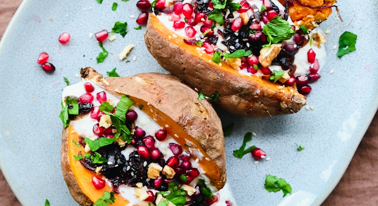 Gepofte zoete aardappel met yoghurt en gekarameliseerde uien.